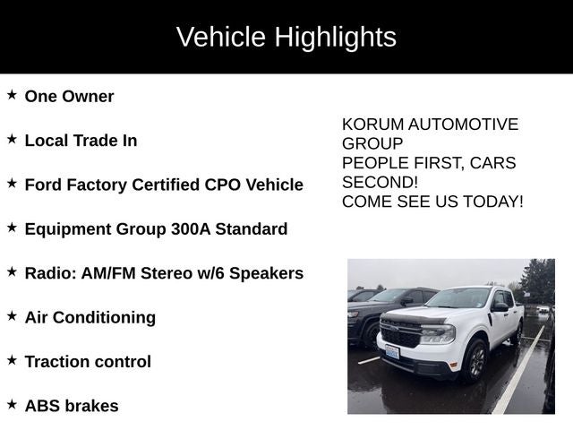 Certified. One Owner, Local Trade In, Ford Factory Certified CPO Vehicle, Ford Maverick XLT, 4D Crew Cab, 2.5L I-4 Hybrid, CVT, FWD, Oxford White, Navy Pier / Medium Slate, 400W Inverter, 4G LTE Wi-Fi Hotspot Removal, ABS brakes, Air Conditioning, Apple CarPlay/Android Auto, Equipment Group 300A Standard, Exterior Parking Camera Rear, Radio: AM/FM Stereo w/6 Speakers, Traction control. 40/33 City/Highway MPG
